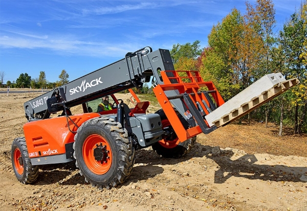 The Skyjack SJ843 TH telehandler delivers an 8,000-pound lift capacity and a 43-foot reach. It is a powerful and versatile tool for material handling in construction and industrial settings.