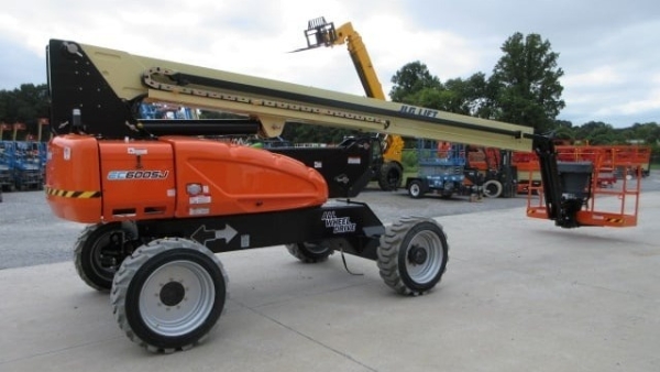 JLG EC600SJ Articulated Boom Lift, Platform Height 60' 3", Horizontal Outreach 43' 3", Platform Capacity 500 lb, Swing 400° Non-Continuous, Platform Rotator 180° Hydraulic, Jib Range Of Articulation Vertical 145° (+75°, -70°), Drive Speed 3.0 Mph, Gradeability 2WD 30%, Gradeability 4WD 45%, Turning Radius Inside (2WS/4WS) 4' 0", Turning Radius Outside (2WS/4WS) 15' 2.5", Operating Weight 16,710 lb, Max Ground Bearing Pressure 52 Psi, Electrical System 48V DC, Batteries 8 X 6V 415 Amp-Hr, Drive Motors Dual Electric Traction, Tires 36 X 14-22.5 Non-Marking Foam-Filled, Hydraulic Reservoir Capacity 15 Gal, Motor Pump Series Wound Motor Gear Pump, Platform Width 30", Platform Length 72", Machine Width 7' 11", Tailswing 4' 0", Machine Height 8' 4", Machine Length 30' 9", Wheelbase 9' 0", Ground Clearance 10"